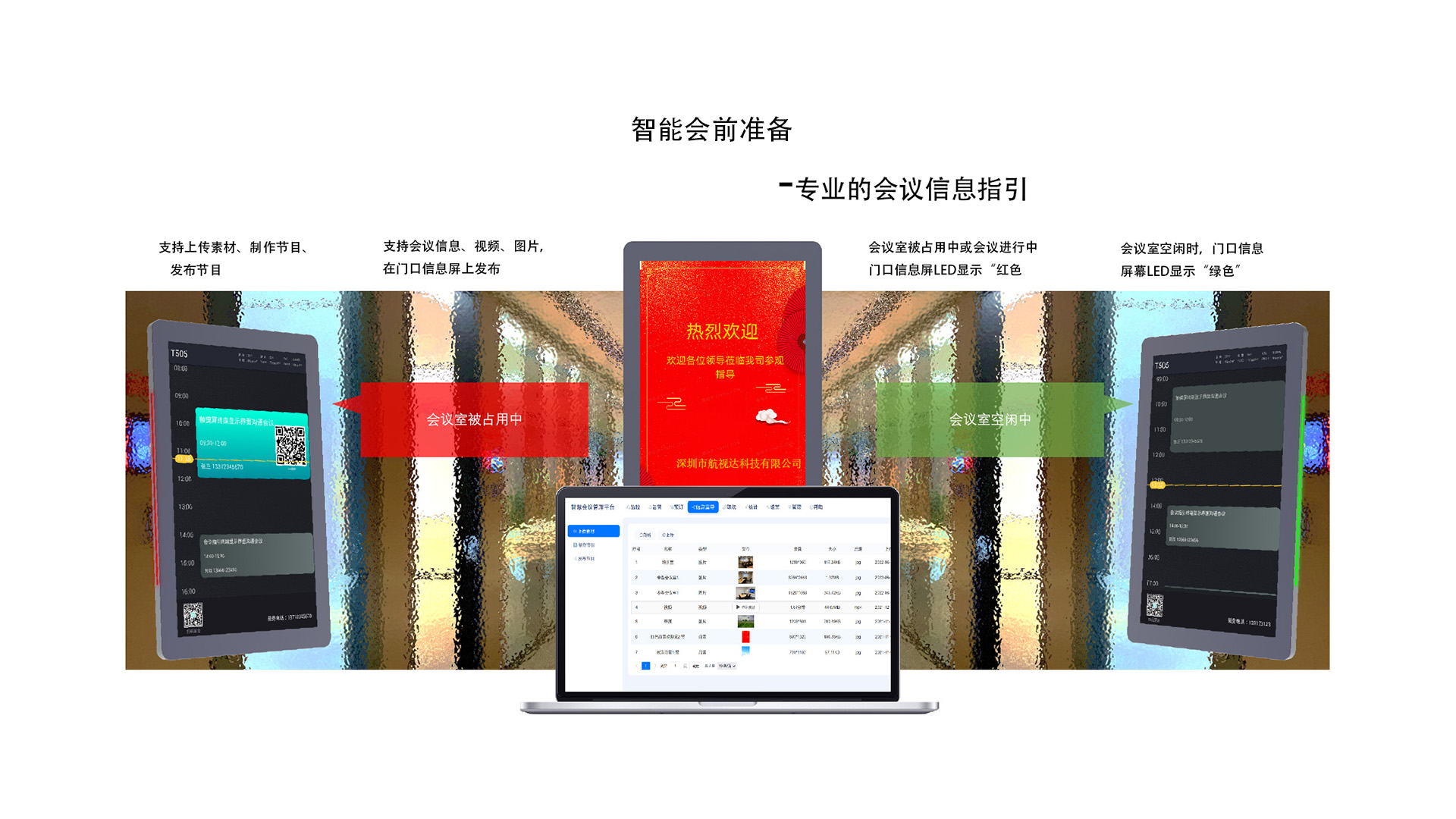與OA、釘釘、企業(yè)微信辦公系統(tǒng)對(duì)接(br) 與用戶OA系統(tǒng)對(duì)接,在不改變用戶使用習(xí)慣的情況下,使用戶的辦公流程完美銜接. 支持在OA端進(jìn)行會(huì)議預(yù)定,下發(fā)預(yù)定信息至預(yù)定屏幕、集中會(huì)議信息顯示屏 -